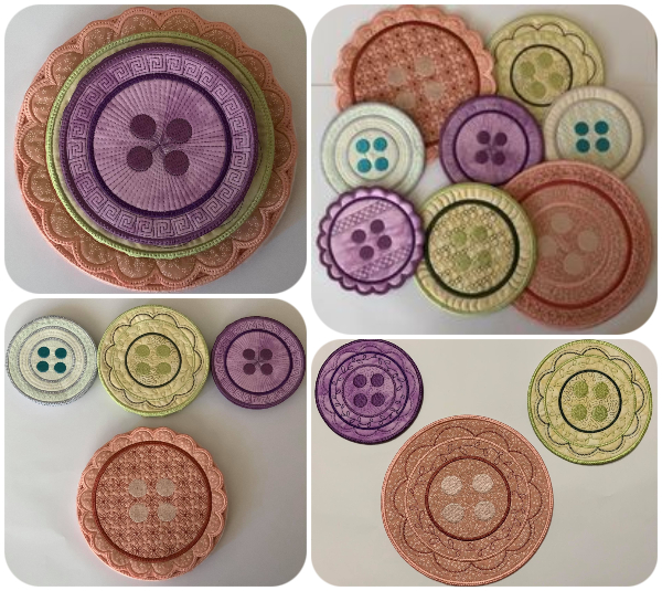 My Mother used to say, “Sit down and button up”. Although she meant for me to stop my incessant chatting, in this case I sat down and designed these button coasters! Made completely in the hoop, they are sure to please sewing enthusiasts of all genres.