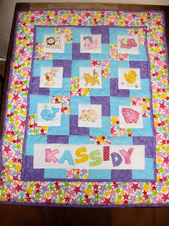 This artwork for this set was so gorgeous, (Clipartoon), I just couldn't resist. You receive 10 filled and 10 applique designs all to fit within your 4x4 hoop. Once again, these designs got the thumbs up from my little ones, and I had to make them T-Shirts. Here is a quilt I made for my best friends first granddaughter.