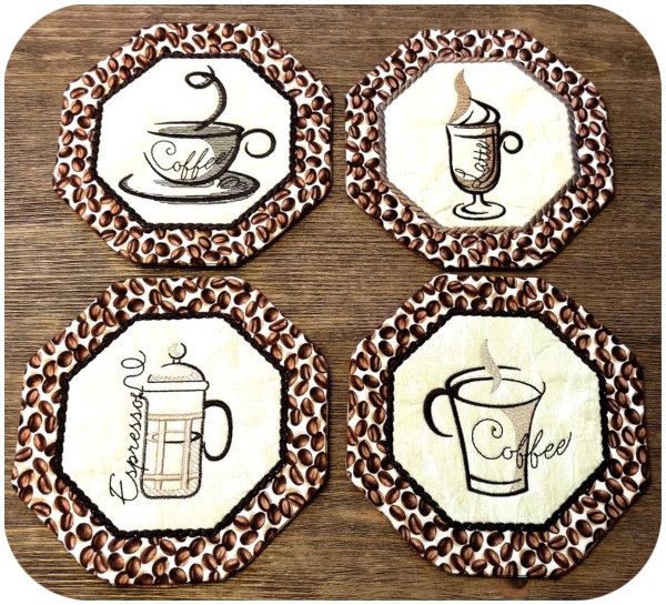 The design set includes 6 4x4 designs plus 1 5x7 and 6 In-the-hoop coasters/mug rugs for 8x8 hoops (full photo instructions included)