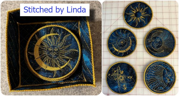 Carlita made this very cute set for her Cousin using the In the hoop Topper 2 design, then used the centre piece to make Coasters and a matching In the hoop Coaster Holder