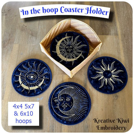 Many coasters have been made to a similar size. I have included the sun and moon (celestial) round coasters, pictured, that fit each coaster holder. You can either use the blank version of these files to add your own embroidery design, or for existing coaster designs, you could reduce by 10% to ensure they fit into the coaster holder.
