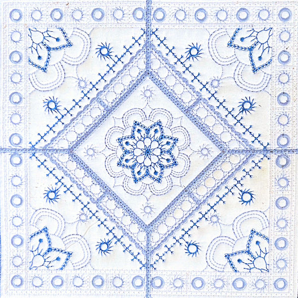 This design is created in five hoopings, which are joined as you stitch, making it easy to create a perfectly aligned large block.